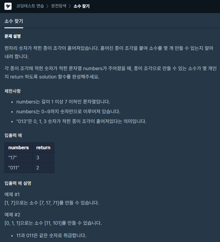 프로그래머스 완전 탐색 부분 소수 찾기 문제입니다.