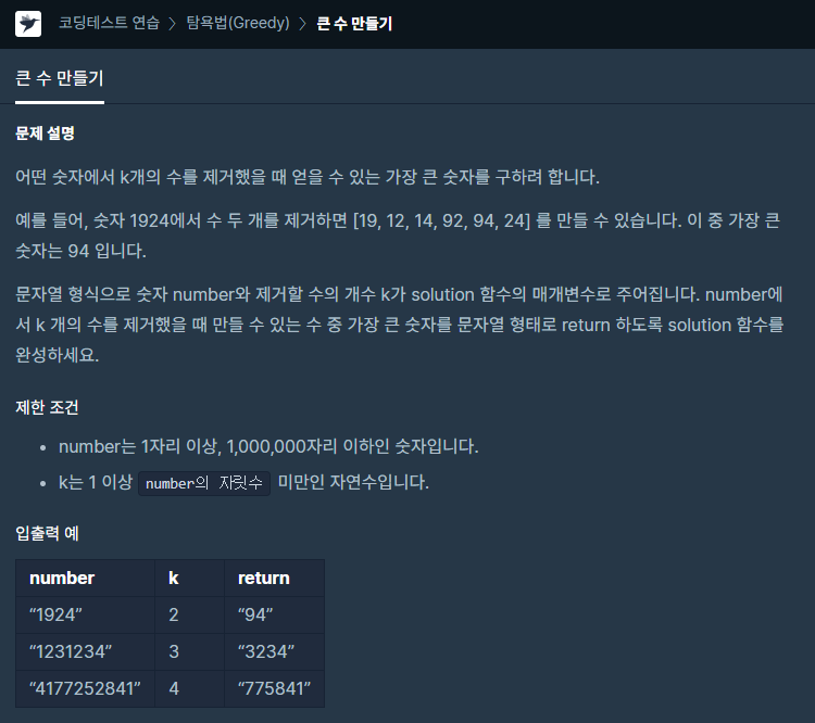 프로그래머스 탐욕법(Greedy) 큰 수 만들기 문제입니다.