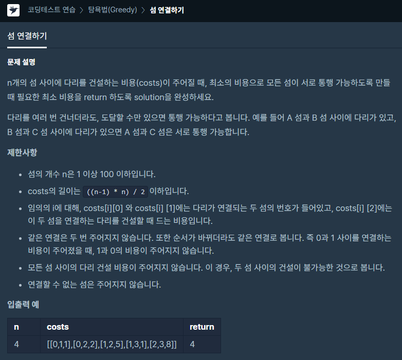 프로그래머스 탐욕법 섬 연결하기 문제입니다.