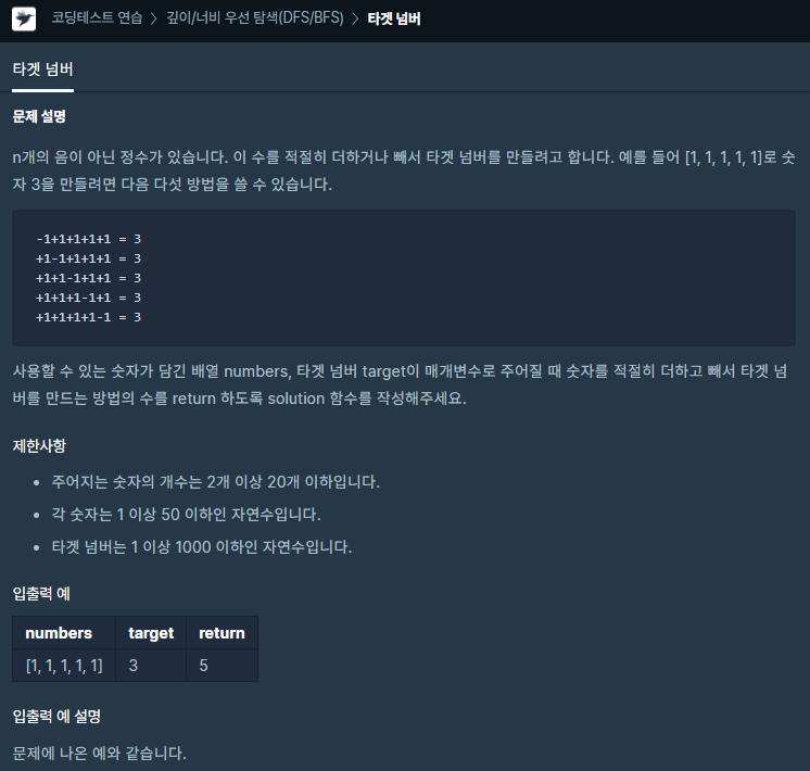 프로그래머스 깊이/너비 우선 탐색 타깃 넘버 문제입니다.