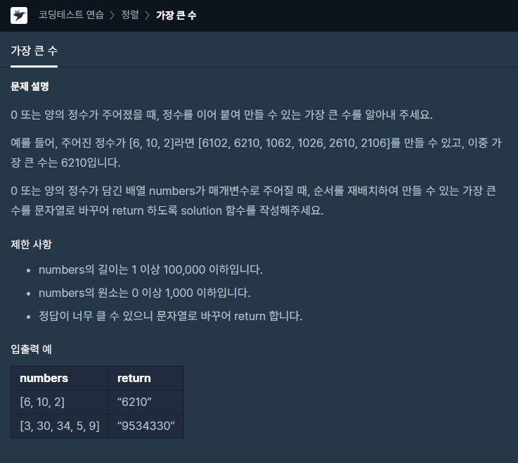 프로그래머스의 코딩테스트 연습 정렬 부분 가장 큰 수 문제이다.