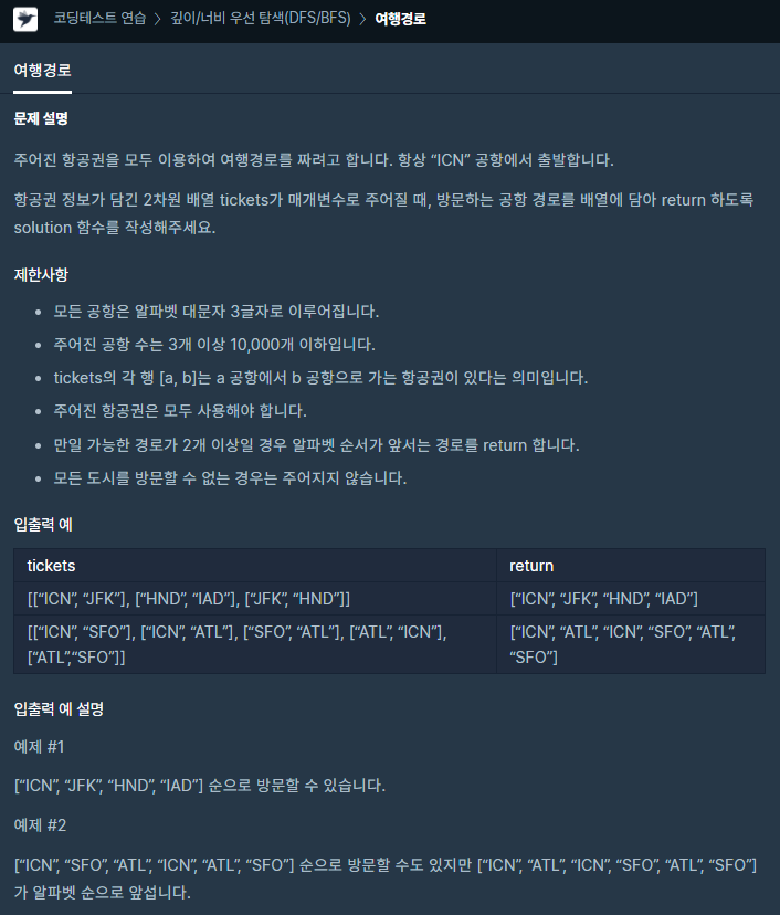 프로그래머스 깊이/너비 우선 탐색 여행경로 문제입니다.