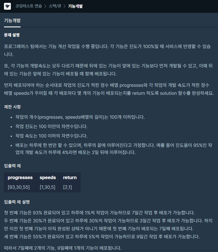 프로그래머스 팀에서는 기능 개선 작업을 수행 중입니다. 각 기능은 진도가 100%일 때 서비스에 반영할 수 있습니다. 또, 각 기능의 개발속도는 모두 다르기 때문에 뒤에 있는 기능이 앞에 있는 ��